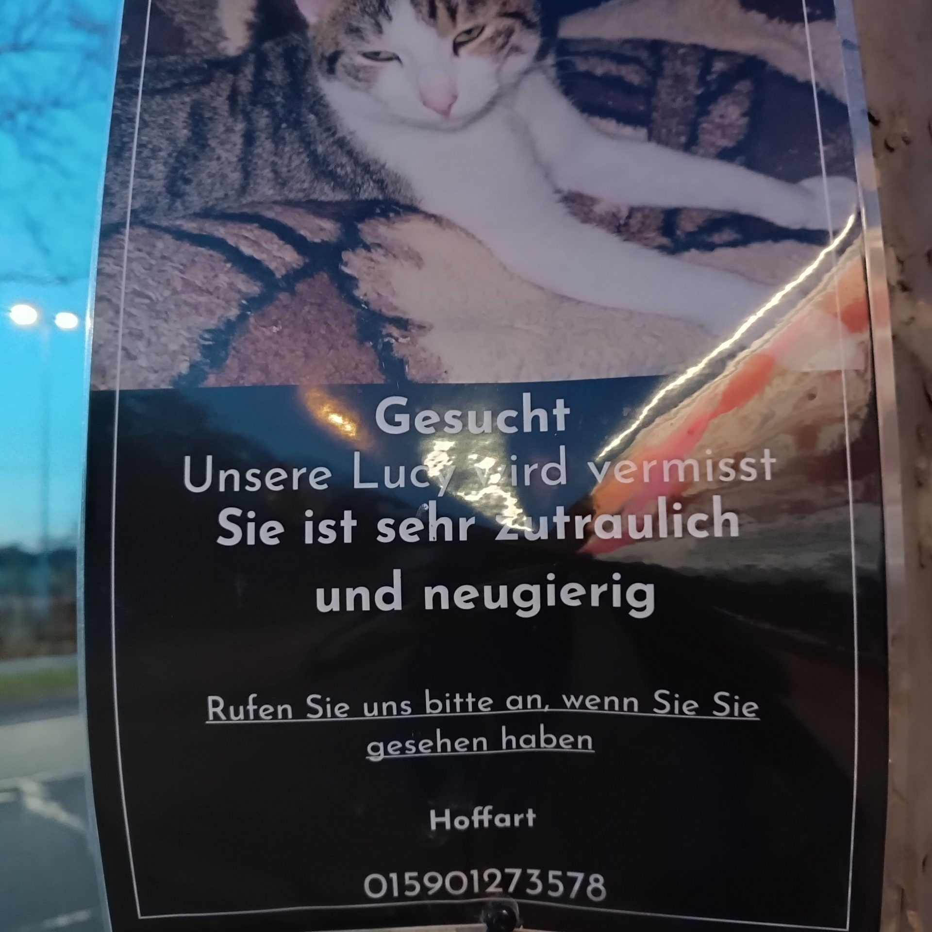 Kurz vorher machte ich noch ein Foto von einem Steckbrief von einer vermissten Katze nahmems Lucy.