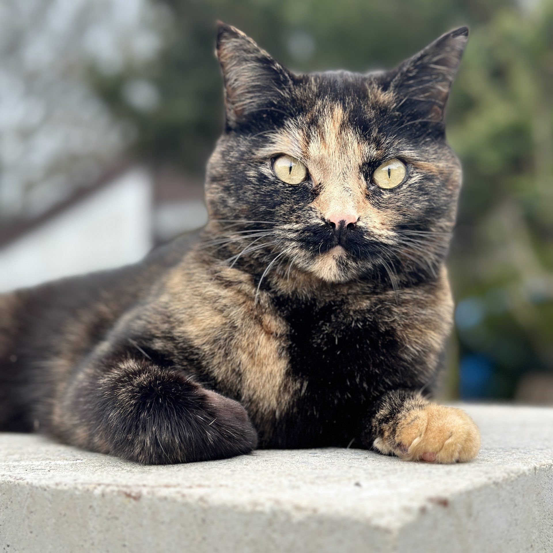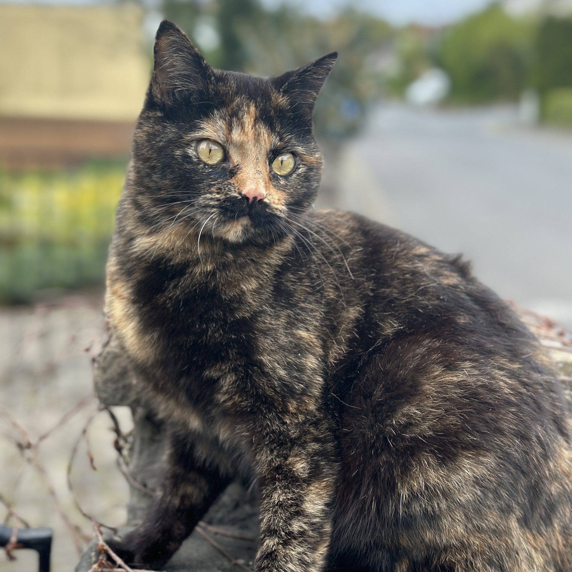 Ihre Farbe ist Schildpatt /dreifarbig, mit einem schwarzen Schnurrbart und vorne links einer goldenen Pfote. Sie ist tattoowiert, gechipt und bei TASSO registriert.